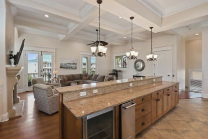 Grand Foyer welcomes you with a barrel ceiling. The living room has ample seating, a large new Smart TV, and is open to the fully equipped kitchen with ice maker and Breakfast bar. Walk out to the back to enjoy the pool. The game room has a Foosball table with other fun activities. Also on this level are 2 Master Bedrooms with ensuite baths, a half bath, a Stack Washer/Dryer and an Elevator.