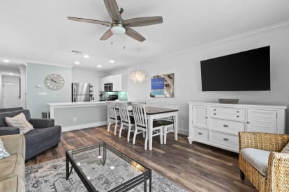 New furniture in the bedroom includes a King-sized Serta Perfect Sleeper mattress with adjustable head tilt, new dresser, ceiling fan, lighting and night stands, plus a 46" wall-mounted TV. The main living area features a new 58" Smart TV, ceiling fan and new furniture including a buffet server with additional storage, comfortable easy chair and 64" wide dresser providing more space for clothing and more. The dining area has new lighting and a spacious table with four drawers and six chairs for meals, games and work space.