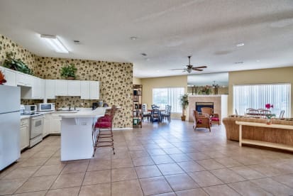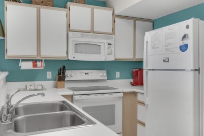 - Full kitchen with dishwasher, stove, microwave, and full-size fridge